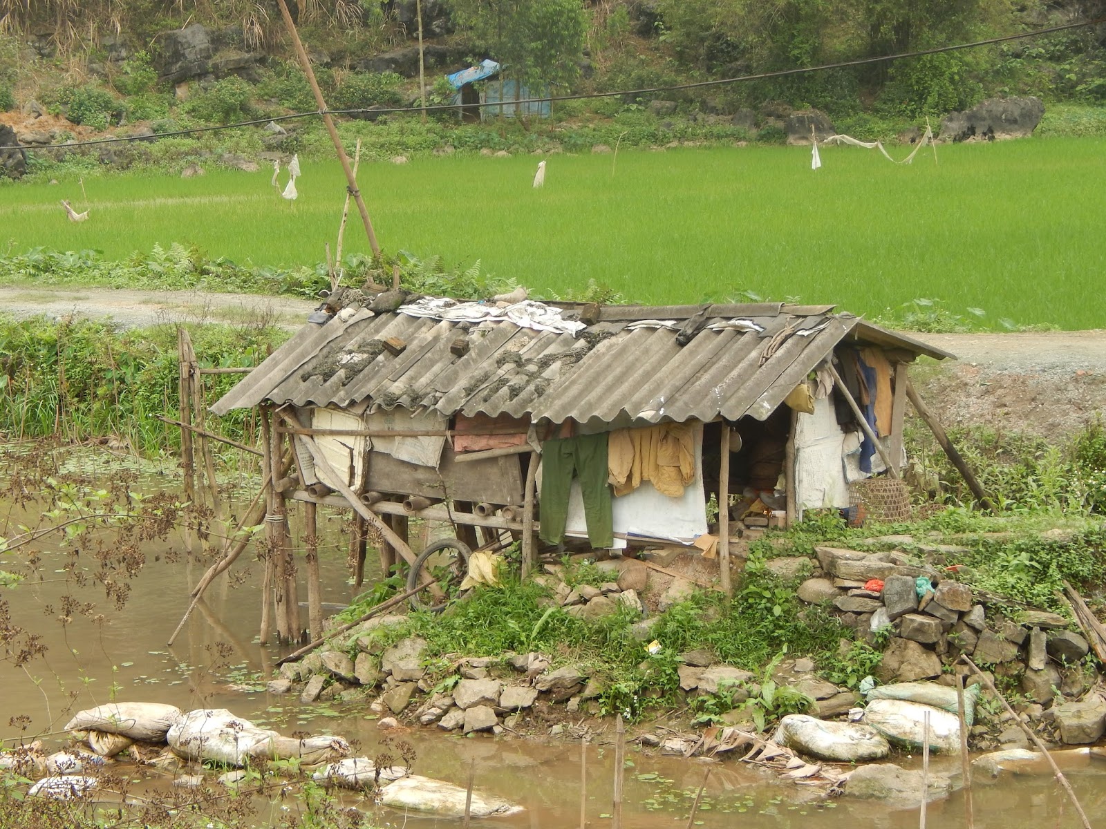 Open outdoor clotheslines are everywhere in rural communities. The clothes themselves reveal the age of the occupants, especially when you see children’s pants hanging outside, then see the same pint sized child playing ball outside of the home, or being washed by his or her mother in a tub of water right by the clothes line. At someone’s home a clothesline outside of their home can reveal more than underwear and pants hanging on it. Some clothes reveal the quality of what they can afford if they are somewhat tattered and torn, but still being used. In one Vietnamese home I passed, there were clearly children living there, based on the pint sized pants that hung from the line.