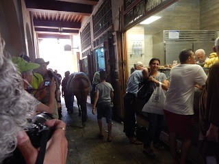 But the real beauty of my time in and around Fez was not in the planned itinerary, but in special moments we had. On the way to Roman ruins some 90 miles away, we saw a Monday market for locals. It was fantastic to walk around and see the donkeys loaded up with goods, and even a donkey parking lot! As we entered the market, a man ran out hurriedly carrying a sheep, probably food for a month. The poor sheep looked bewildered. I saw Singer sewing machines everywhere as people lined up to have garments repaired. We even saw a man sitting next to a vat of water with two cups. He was a water salesman. I learned when we were walking around the Royal Palace earlier, that one king wanted there to be water available to him at all times, specially in summer. So, the concept of a water salesman emerged and has continued. I was not only in a different century, but a completely different time.