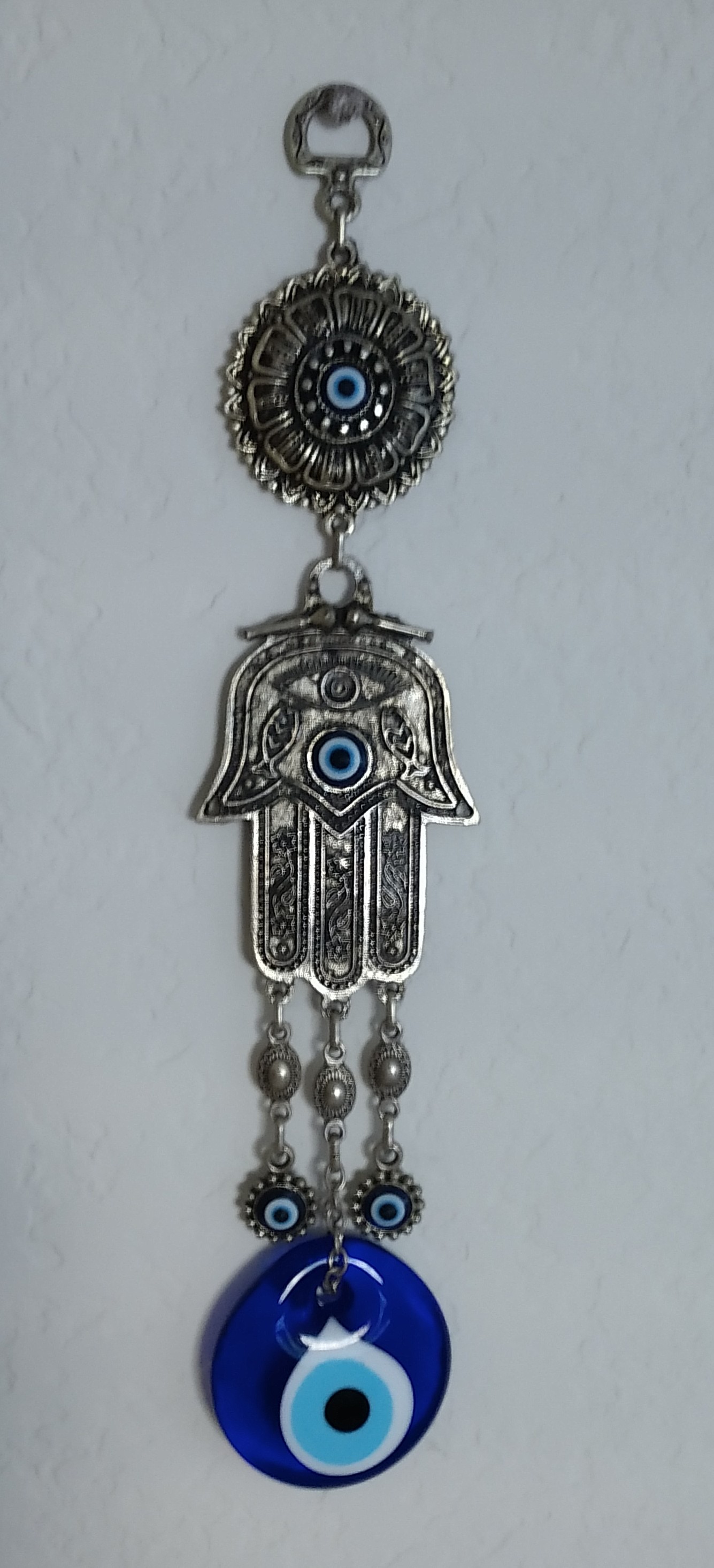 The amulets to avoid the Evil Eye can be found all over Turkey in just about every form; paperweights, wall hangings, earrings and other jewelry, refrigerator magnets, and more. They are often found combined with a three fingered hand, the hamsa hand. The word hamsa, also spelled khamsa and hamesh, means “five” referring to the fingers of the hand. In Jewish culture, the hamsa is called the Hand of Miriam; in some Muslim cultures, the Hand of Fatima. The Miriam hand of the Jewish cultures have five full fingers pointed downward, while the Islamic version has three fingers pointed downward.