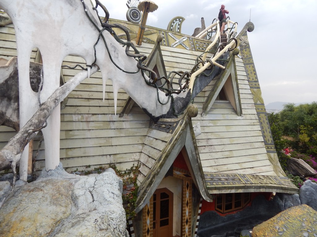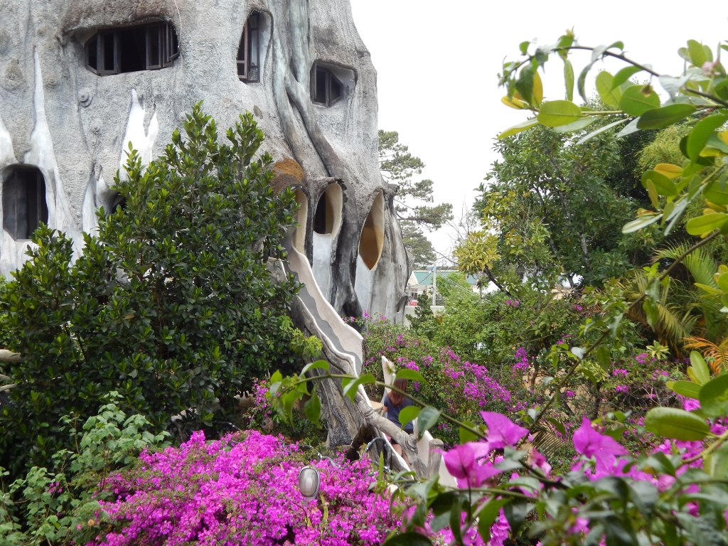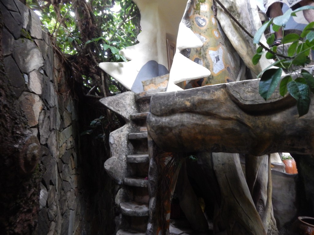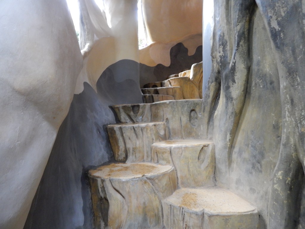 The real architectural delight for me, however, was a break from the group to see Crazy House, a Gaudi-like structure across form our hotel. This unique house was designed by Vietnamese architect Van Diet Nga. He has a PhD in architecture from Moscow State University but claims inspiration from Spanish architect Antoni Gaudi for this work, along with other notables such as Salvador Dali and Walt Disney. The inspiration for the whimsical, the surreal, and the fanciful is clear upstairs, downstairs, and all throughout. Having recently been to Barcelona, I recognized the style instantly although there was no mention of Gaudi when I read about the architectural influence while there. But it became obvious as I meandered through the playful and joyfully curved design of the house; the unexpectedly winding stairs both up and down; and the massive and ever-present banyan tree in the middle of the home inside and out, that was literally a sprawling playground of a house for young and old to crawl through and enjoy.