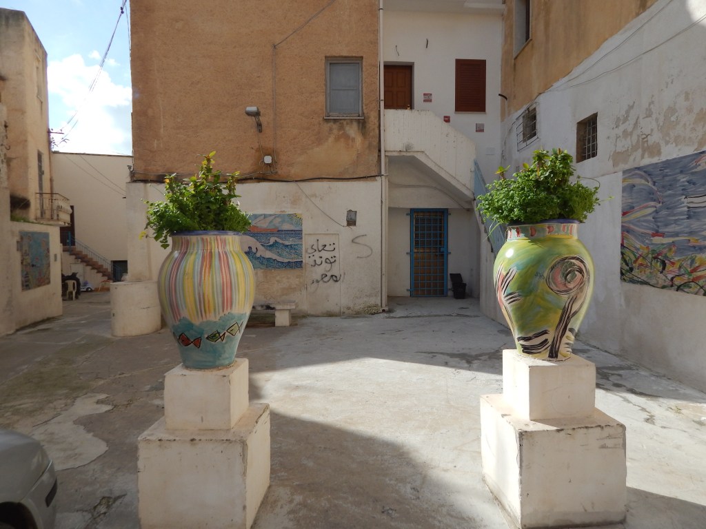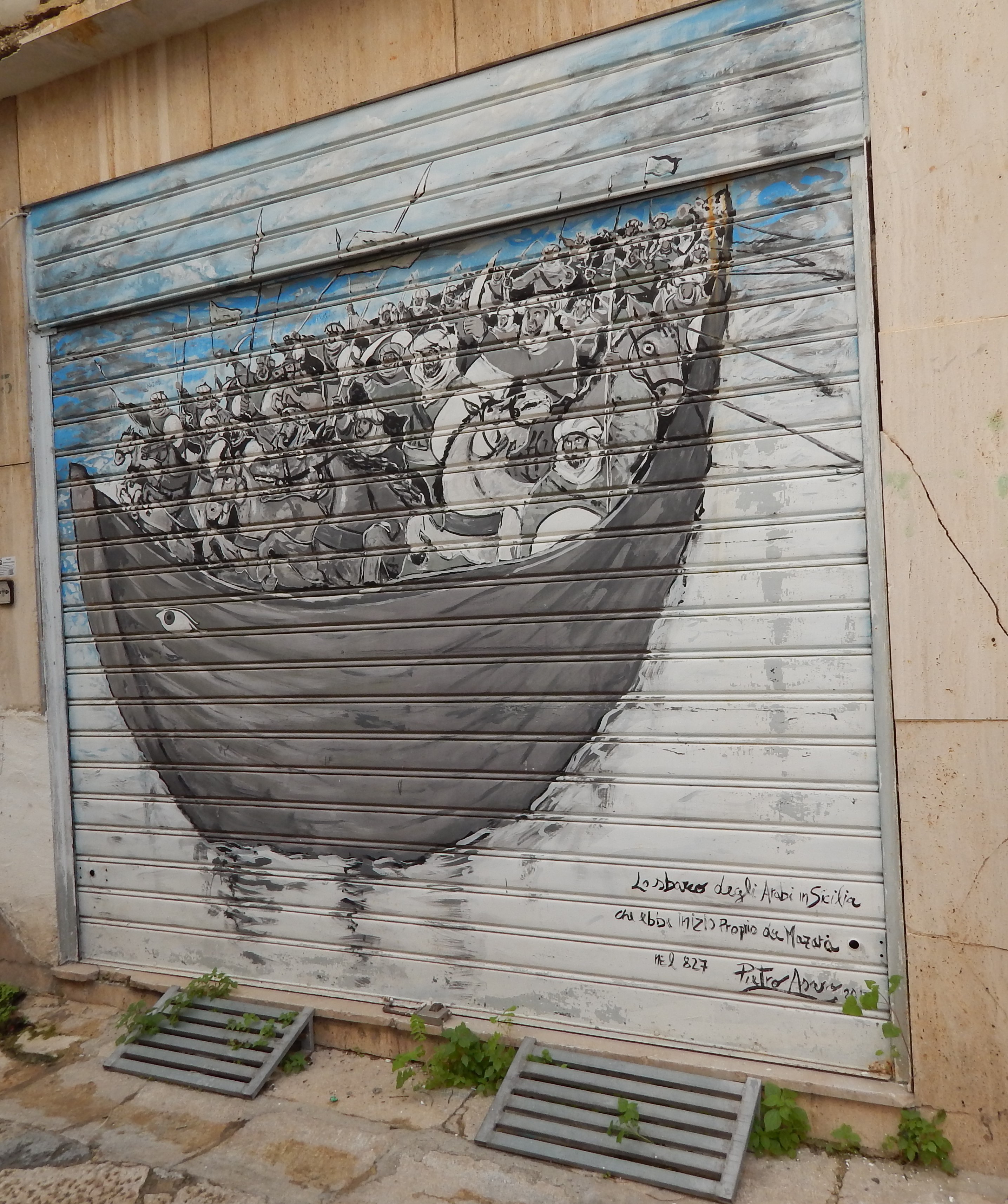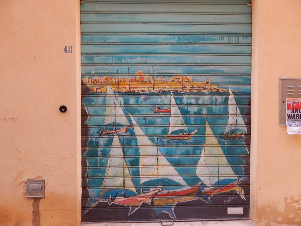 The Tunisian Casbah had been abandoned after the war, repopulated, then abandoned again after the 1968 earthquake, and today some gypsies can be seen there and very few others. But the street art was astonishing in its uniqueness and professional quality; some created in tiles on walls or benches, some painted on old, abandoned doors. We saw some of the people’s story during our stroll, as we saw art on one door of refugees coming in a boat from Tunisia. A good majority of the street art was sea faring in nature. Mazara del Vallo is a seaport, and the Tunisian story is one of a harsh arrival by sea under poor circumstances to an impoverished part of Sicily.