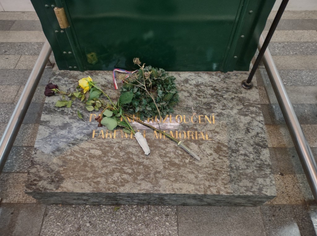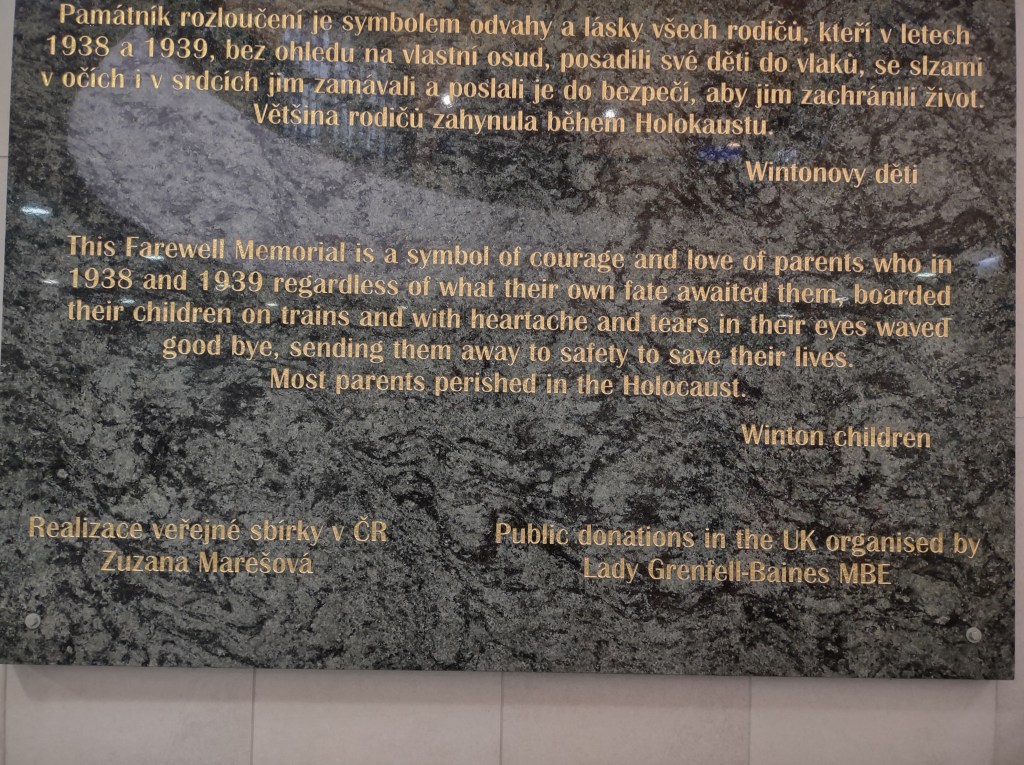 After we spoke to volunteers there who had been holding a sign pointing to the direction of refugee assistance that looked like the Ukrainian flag, we walked further around Platform 1, and a different refugee history emerged before us; a statue of Sir Nicholas Winton holding a child, with a suitcase on the ground. Sir Winton was a Jewish Englishman who saved over 600 Jewish children by putting them on trains, separating them from their families, and saving their lives during World War 2. This was the Czech part of what is now called the kindertransport. There was an additional, heart wrenching monument of tiny hands touching larger hands on either side of the train window pane; symbolic of the children who left their families on Platform 1 thanks to him, and bade farewell to parents who most likely perished in the Holocaust. Sir Winton was a businessman, who simply wanted to save Jewish lives, and he asked for nothing in return.