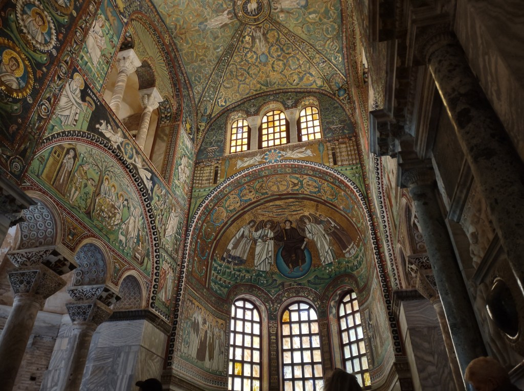 I was much less impressed, and somewhat disheartened to learn how so many churches were being built and glorified during the years of the Inquisition. even though the Spanish Inquisition (1478-1834) and the Roman Inquisition (1542-1858) occurred at different times and Italy wasn’t united until much later (1871 to 1918). But that is why we travel. We take in the whole picture, the good and the bad, and we learn. We saw art in one church on the base trip that was anti Muslim back in the day and could still be perceived that way today. In the first of the mosaic churches in Ravenna, they had built a wooden sculpted monument to all religions using all religious symbols but that of Judaism. That was history, and we were face to face with it. But in the beautiful Basilica in Ravenna, I saw inclusion. So, I wanted to sit down and digest it, whether it was truly part of their history or not. The history of the Ottoman Empire and the Byzantine Empire were rife with holy wars. Yet this basilica was intended to portray all of humanity.