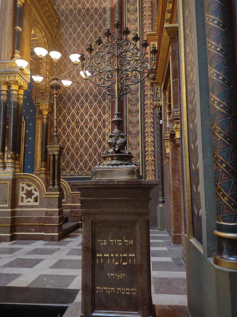 The New Spanish Synagogue (1868), right behind the statue of writer Franz Kafka, is the most beautiful of them all, and has been turned into a museum of 20th century Jewish history in Prague, especially as it relates to the Holocaust. The synagogue itself is a reform synagogue and is still aligned with the Reform Jewish community there who in fact had a Friday night service when I was in Prague last. That practice has apparently stopped. It was built in a Moorish style and fell into disrepair twice in the early 20th century. It was restored in all its splendor after the Velvet Revolution of 1998. It is situated next to a church and is actually the newer synagogue in the Jewish quarter. The older Spanish synagogue was in the same location exactly as this newer Spanish synagogue but was demolished in 1867 and the newer on was built. It has an organ and pews as a church would, rather than benches against the wall for sitting. It is currently administered by the Jewish Museum of Prague. Services are only held there now on special occasions. Glass cases of artifacts from the Holocaust surround the walls of the lower half.