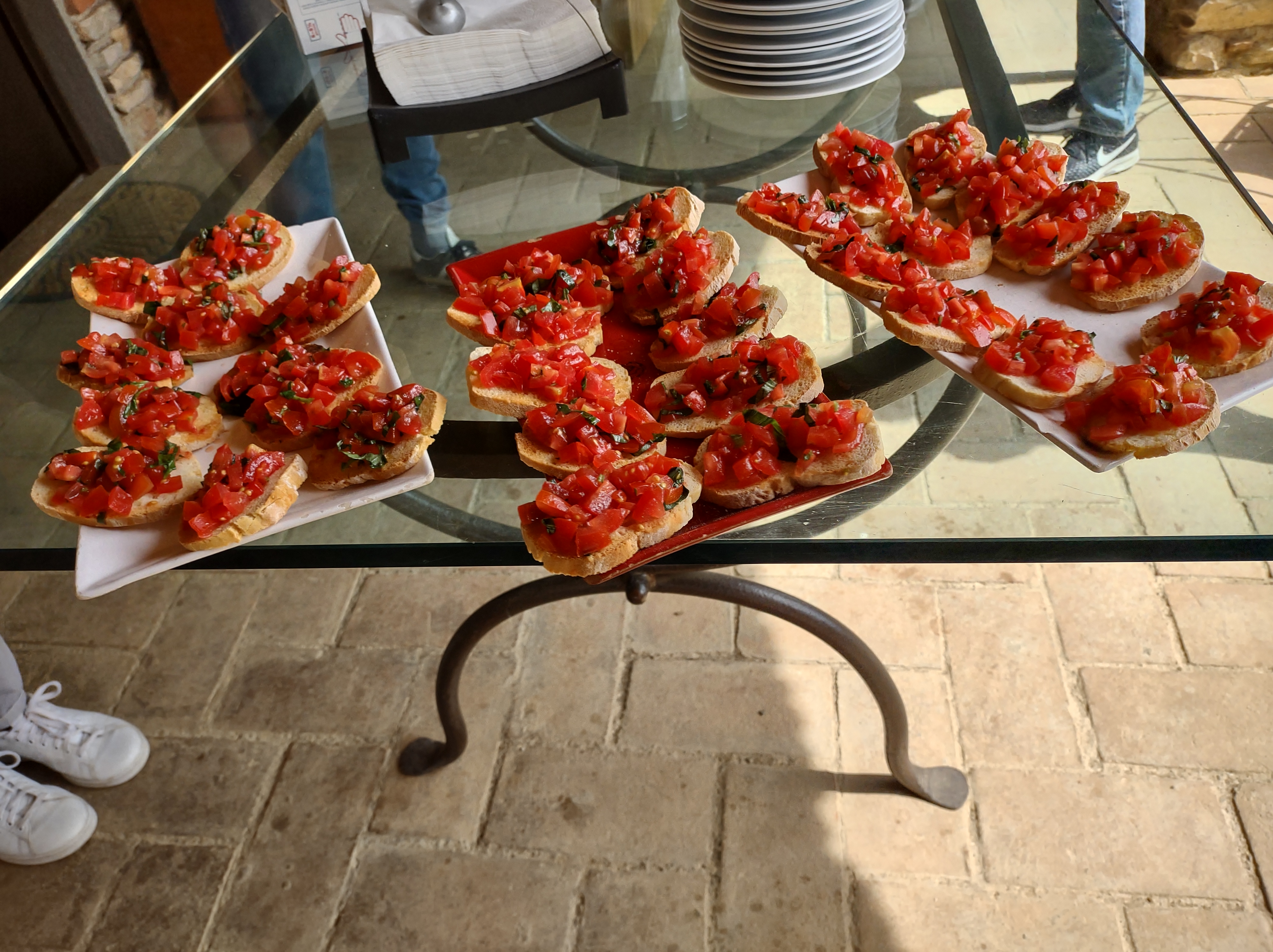 Our group enjoyed an olive oil tasting at their mill Salone dell’Olio.. The Pruneti brothers opened it in 2020. The land and it’s 30,000 tree olive tree grove was taken over by the three Pruneti brothers in 1990 after the family owned the land and produced olive oil as a family business for 160 years. Even though it was the third olive oil tasting I’ve gone to on an OAT trip, it was completely different from the other two I’ve been to, one in Israel and one in Sicily. They didn’t serve any food with the oils as the other olive oil mills have for travelers who wanted to learn and experience the tastes. Rather, we were served three small glasses, and we tried three different extra virgin oils in the shot glasses that we had to warm up with our hands first before sipping. It was more like a wine tasting, where we could taste different ” notes.” The three oils had very complex and uniquely different tastes, after tastes, and clearly distinct notes as we tasted them. One in particular even had a striking kick to it after my tasting. I was able to find the name of the company online, because a group member suggested I photograph it when we learned they were available to purchase on Amazon for a more reasonable price then having to pay the shipping cost back to the US. However, if purchased there, we were told the shipping is less for two bottles. In addition, we were told that not all three were available online.