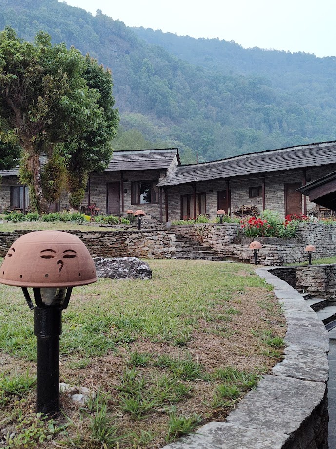 We hiked down from the Annapurna region on our last morning, and the Annapurna peak was visible for a change before breakfast. We also briefly saw Fishtail Mountain before the clouds covered both. But it was a glorious ending to our three nights there, and we trekked to our waiting bus in under two hours., passing men building roads by hand. Annapurna means sustenance, and it is part of a Hindu legend, named after the Hindu goddess of nourishment. It literally means ” everlasting food,” which can be very much the case as water runs from this part of the Himalayas into the Annapurna Valley. We drove twice past the Seti River (where we would later raft and camp), and water levels were then low until the monsoon season began. That is when the cycle of nature begins anew, rice growing season starts, the fires end, and sustenance would again fill this part of Nepal. Annapurna.