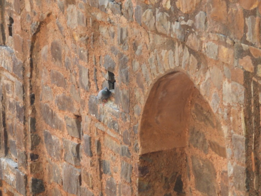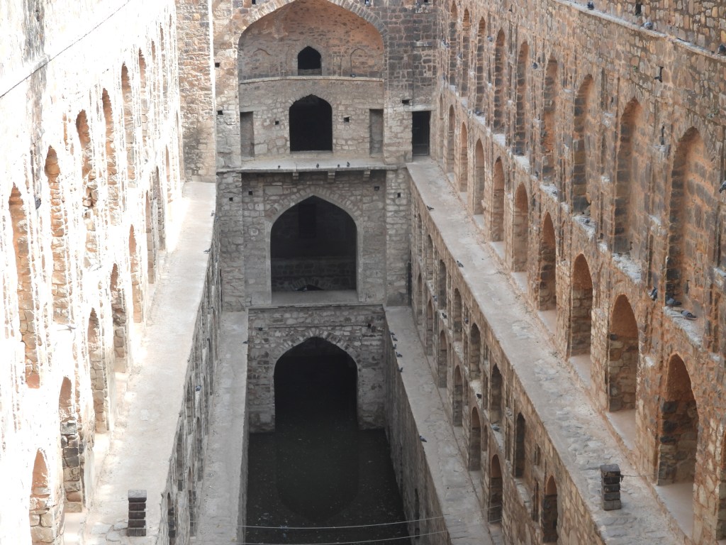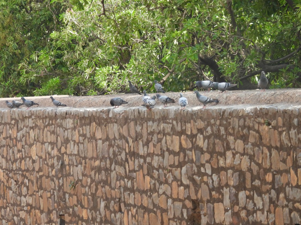 The first place we went was to see an ancient step well near the hotel called Agrasen Ki Baoli. It’s got 103 steps total that lead from the steps to the water it holds, and was built in two different phases. It was believed to be built by King Agrasen, then rebuilt around the 14th C. My guide said it was built in two different parts, about 8 centuries apart. Huge winged birds were flying overhead and landing on the step well walls, some pigeons as well, and it created quite an effect as I looked at this ancient step well, a repository for water in days gone by. The geometric shapes in Indian step wells always amaze me.