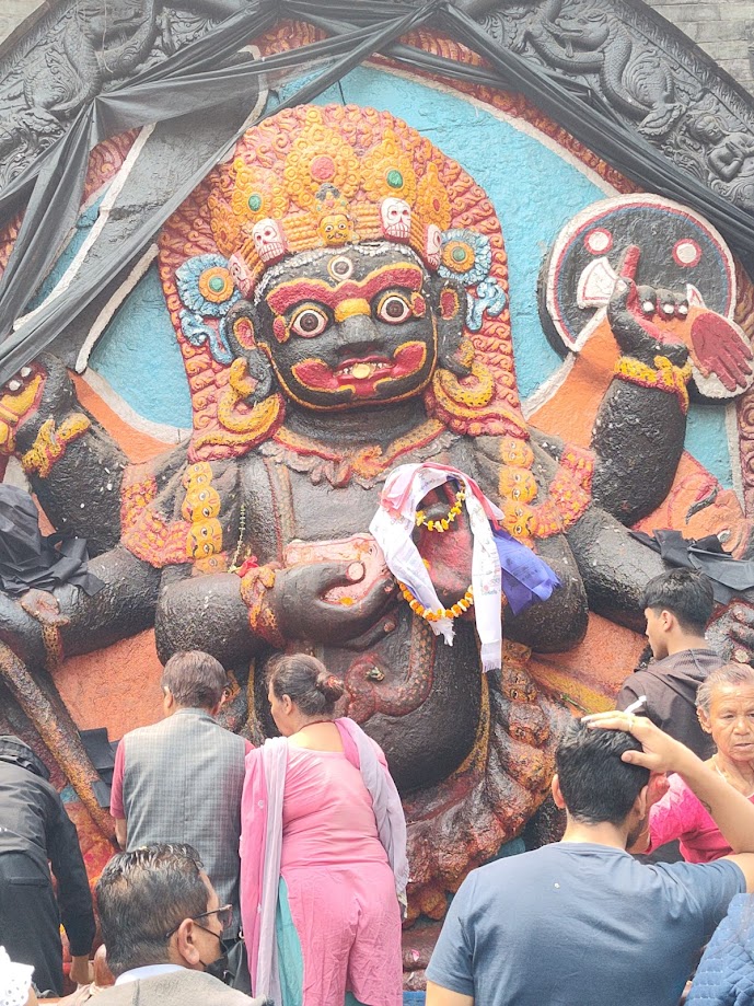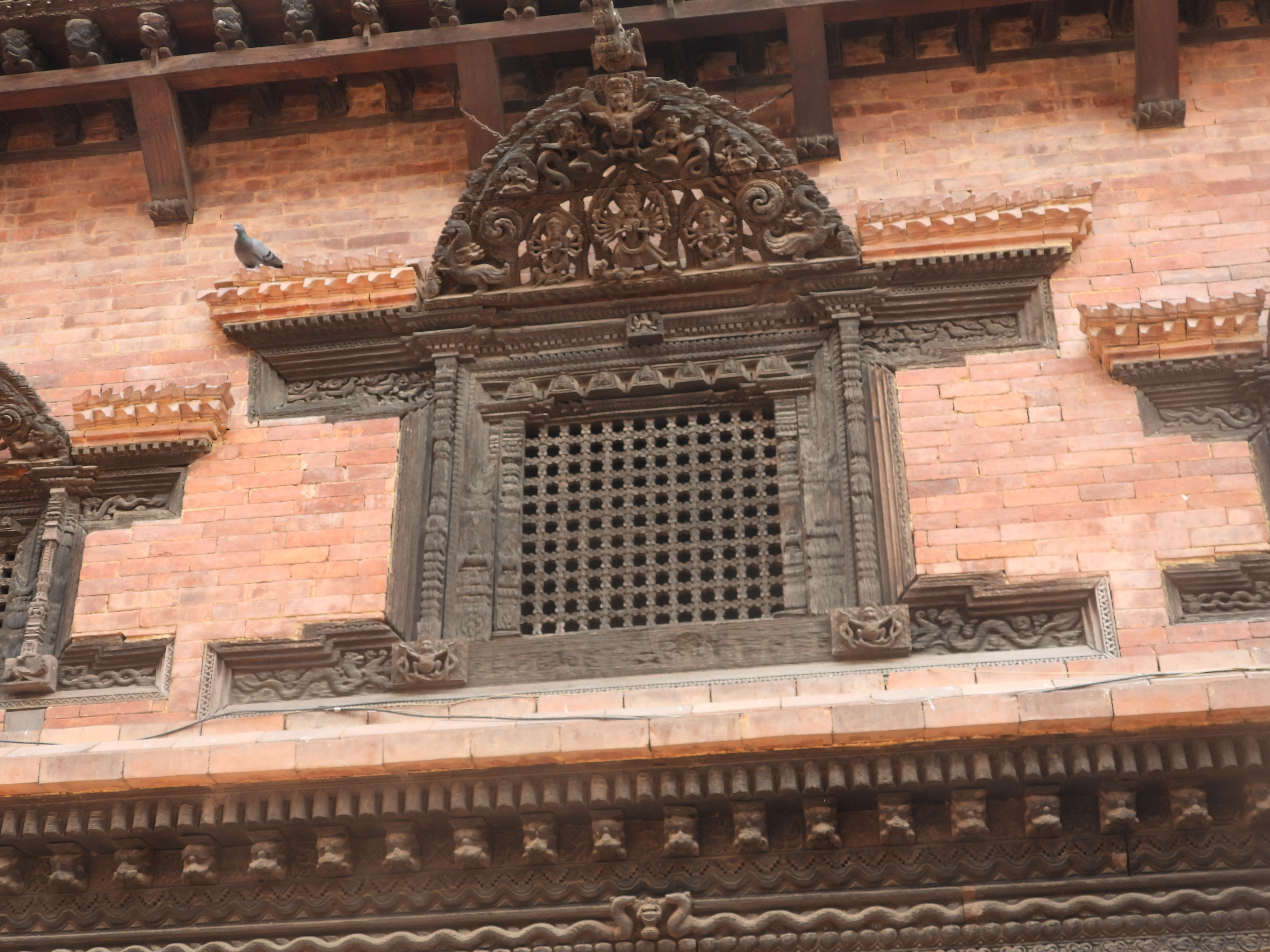 First, we went to Dubar Square. There are four by that name in Kathmandu, one I saw previously in the old city outside of Kathmandu that had suffered so much earthquake damage. The Dubar Square I saw this time was right in Kathmandu. Back in the 60s and 70s Kathmandu was popularly mentioned in several songs because there was a thriving drug culture there, right in Dubar Square. The drug culture has gone, but apparently one can still buy a hash pipe on that street and other paraphernalia. I was more interested in the temples and all the rituals that were going on around me, which completely consumed my interest. The first temple I examined closely was huge, and apparently made from a single piece of wood. The wood window carvings were a piece of art unto themselves. I was completely in my travel element as parades walked by, people stopped in various shrines and temples for blessings, gave offerings, lit candles, drew colorful painted signs of celebration on the ground as I have seen in other Hindu celebrations, and so much more. There were over 50 temples in this Dubar Square. I learned that all five senses are recognized in Hinduism, and we saw that at one shrine where my guide explained all that to me as so many candles were being lit everywhere. We even saw a Hindu carving also made of a single piece of wood.