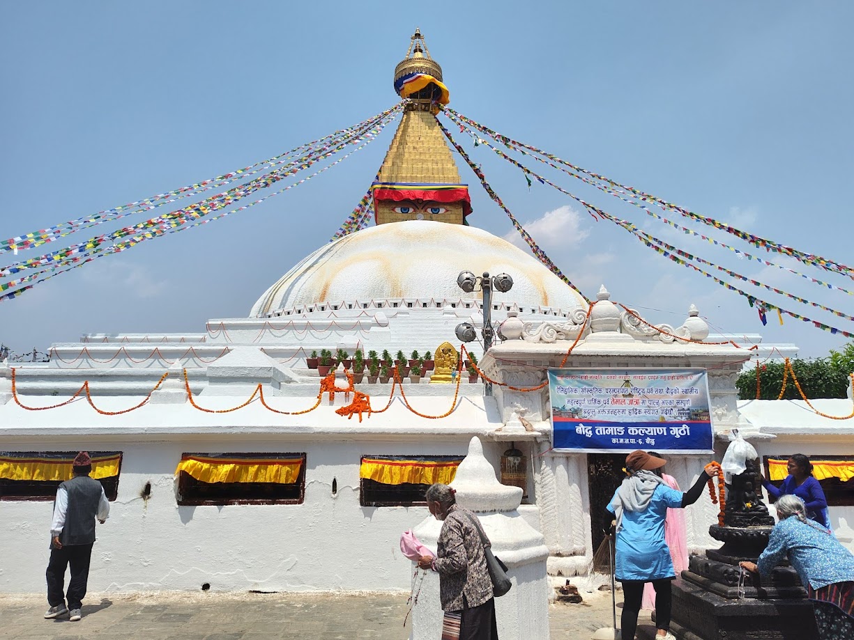 One recommendation I’ve had from several sources was to go to the tourist hub called Thamel. The Thamel area goes on for blocks with stores, travel agencies, and restaurants. While walking I took out my phone at one white Stupa and used Maps.me to get to the Kathmandu Guest House, recommended by a cousin. It’ was fantastic. In the middle of all that chaos is a quiet hotel with three art galleries, close to an area called the Garden of Dreams, but with its own beautiful garden, a lovely outdoor restaurant, and more. There was an art biennale called the 2024 Spiritual Edition. The nearby Garden of Dreams was peaceful and tranquil, it’s open from 9 until 9, and seniors get in for half price (I was even asked for ID). It has six pavilions, a restaurant, tranquil gardens everywhere, and was built by an English general in the 1920s . It’s privately run now.