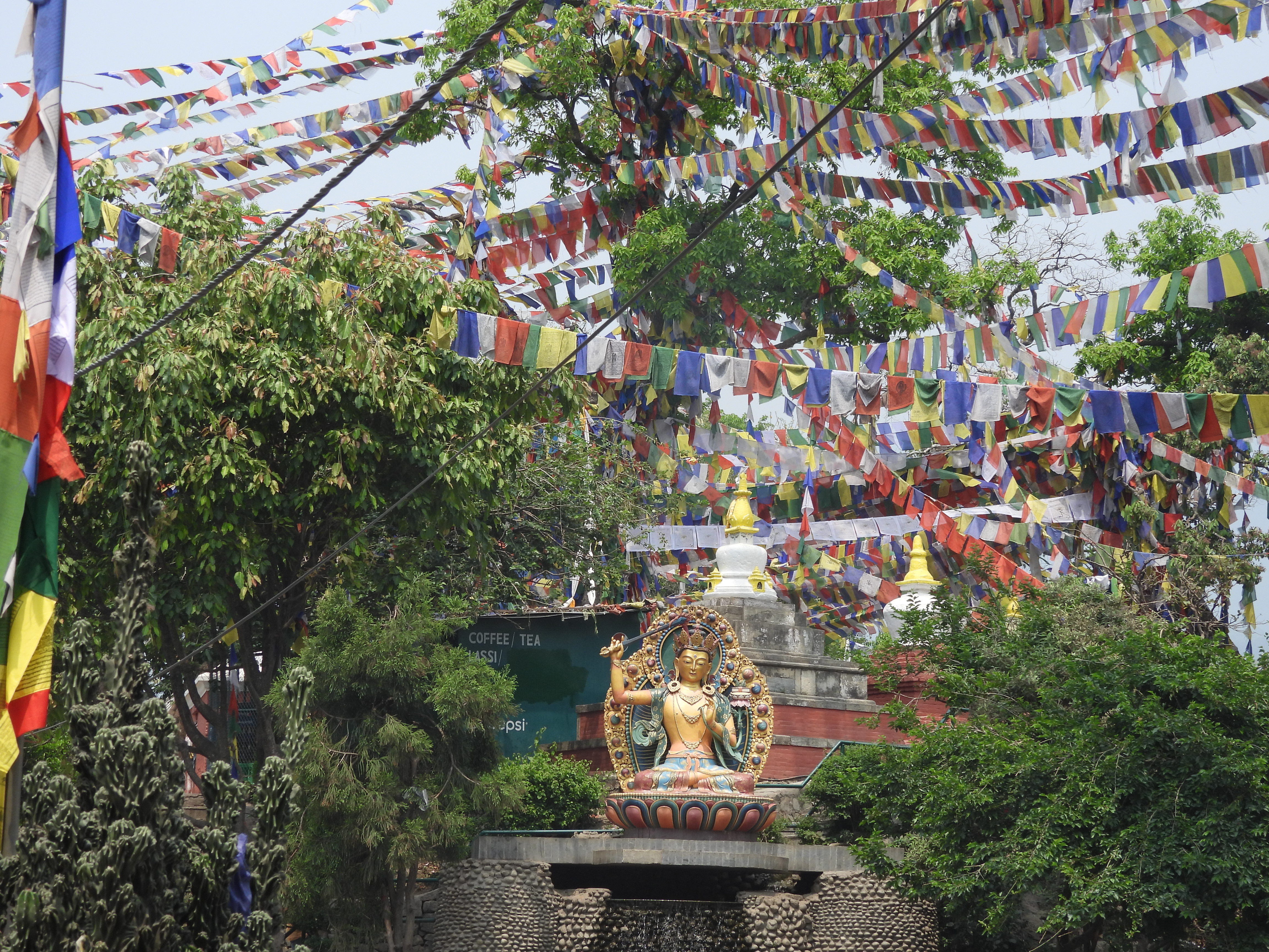My next leg of the trip was two weeks in Nepal with the Overseas Adventure Travel trip Nepal and the Mystical Himalayas. I experienced all seven of the UNESCO World Heritage sites, and Hindu new year celebrations were still going on for the year 2081. Everyone dressed in festival attire, many wearing red saris everywhere. At one of the Dubar Square sites (there are four in Kathmandu) I was completely in my travel element as parades walked by, people stopped in various shrines and temples for Hindu blessings, gave offerings, lit enough candles to create a small fire, drew colorful painted signs of celebration on the ground as I have seen in Tamil Pongal celebrations, and so much more. Since the Hindu Tamil new year and the Buddhist New Year were at the same time, I saw the Buddhist celebration when we went to the Monkey Temple.