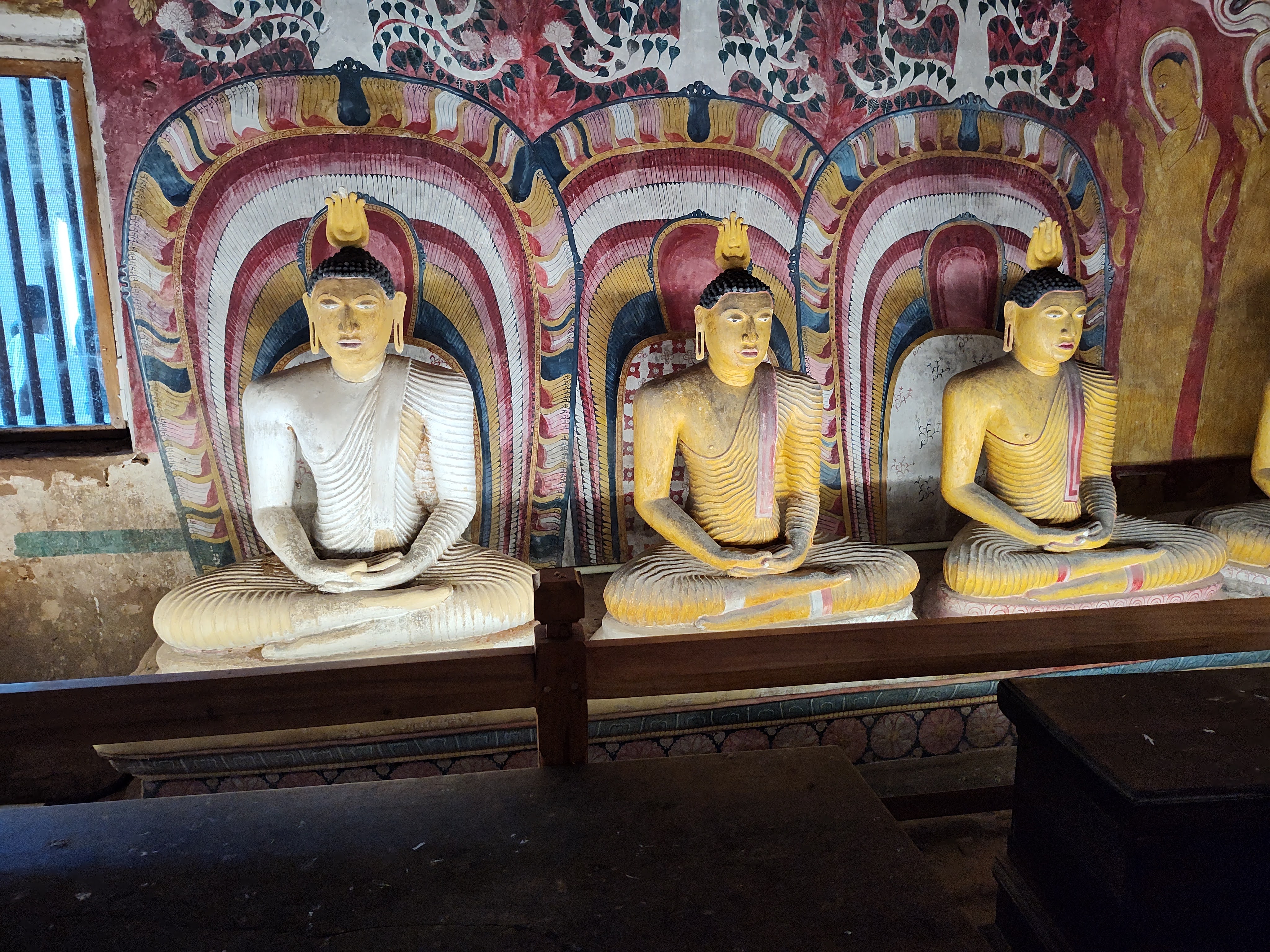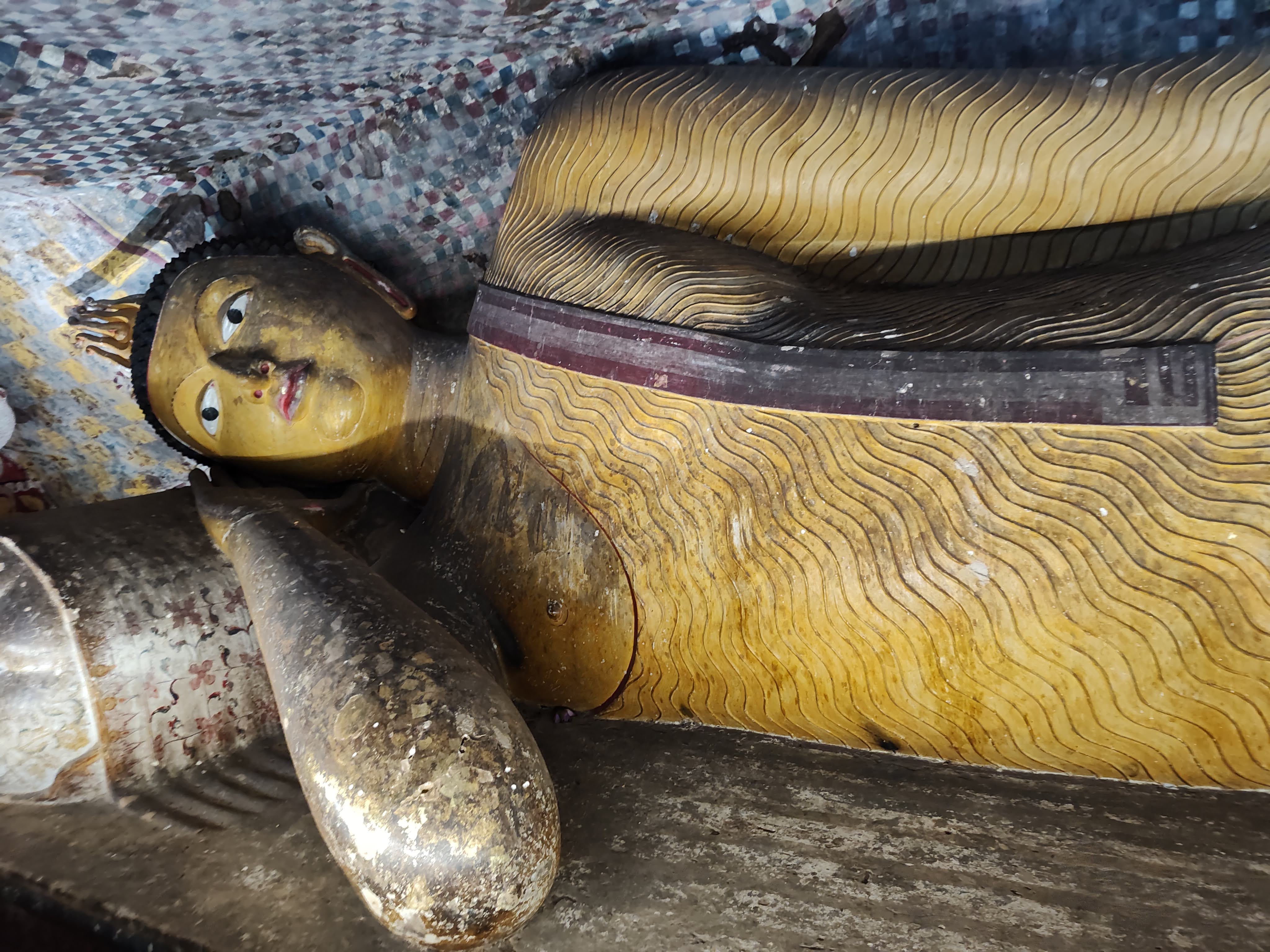 We went to the Buddhist temple caves of Dambulla which is a UNESCO world heritage site, as well as a pilgrimage site for Buddhists. There were five cave temples in the complex, and the art as well as the Buddhas were extraordinary, not to mention the whole feel of the place.  It’s over 2000 years old. I counted four reclining Buddhas(there might have been more), and one of those was a Buddha who had passed away. Their toes appear to be separated when a Buddha passes away.