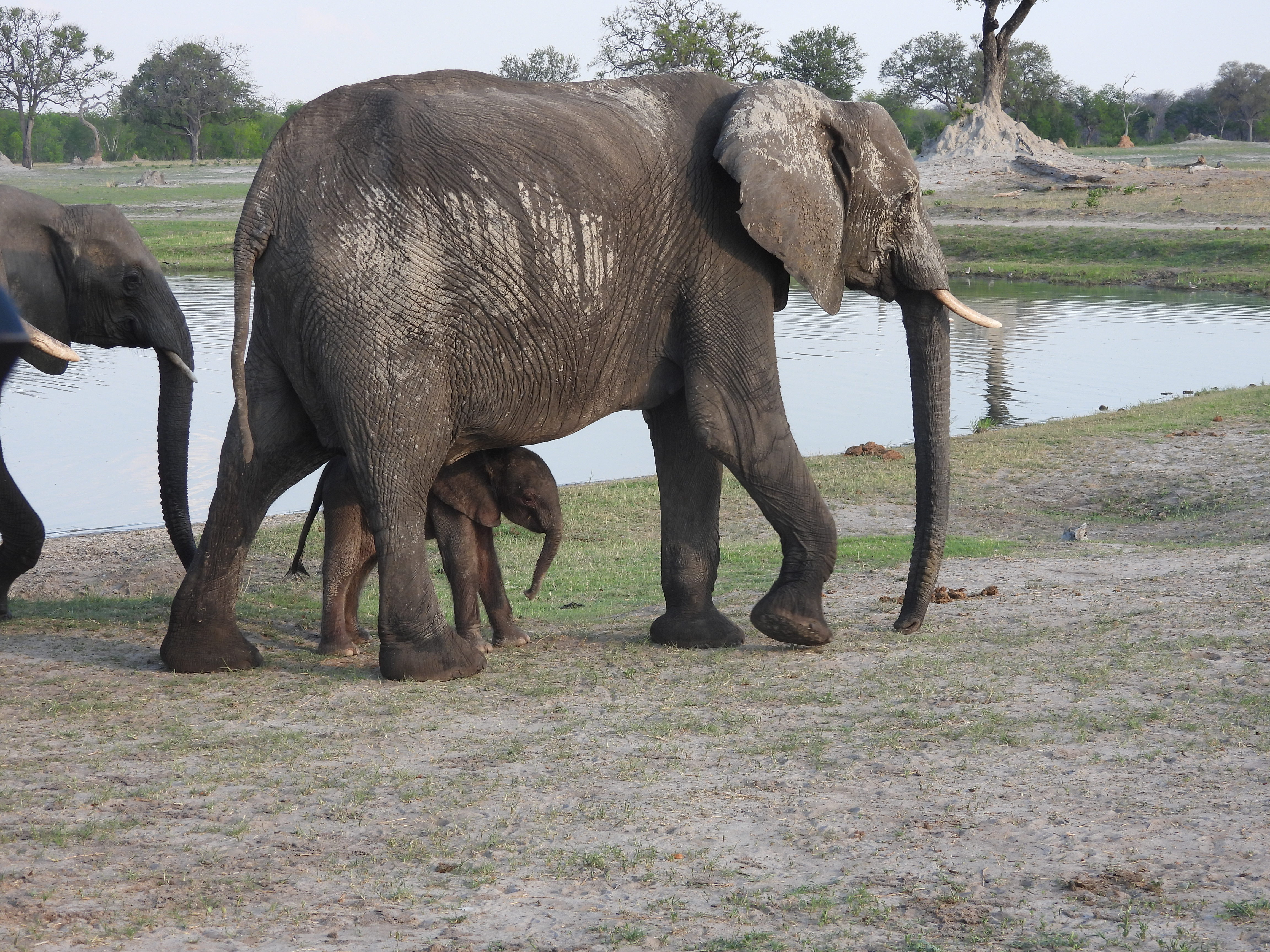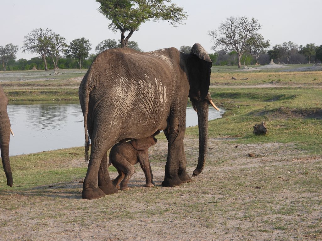 Hwange Park is well known for having over 65,000 elephants. Being Green season, we saw many babies. But the elephant highlights in terms of babies came during our first game drive the morning after our arrival. We saw four different herds coming from multiple directions to meet at the watering hole. One herd stood out, because a tiny newborn was learning to walk and kept getting stuck. The mother had to keep pushing her child along, even pushing the baby into the water to cool down in the extreme summer heat, then helping the little one back up again using her trunk. About three females helped hide the baby from the sun as well, which enabled the mother elephant to get cool in the watering hole while the baby was being tended to. Even after watching the baby elephant laying on the ground resting we were afraid the baby would end up as an appetizer for the pride of nearby waiting lions we saw on the way to the watering hole. It was high drama in the African Savannah, but the mother finally fed her baby after the various cooling down and resting methods, and the baby then continued on with the rest of the herd like a trooper. What an exhausting day for a newborn!
